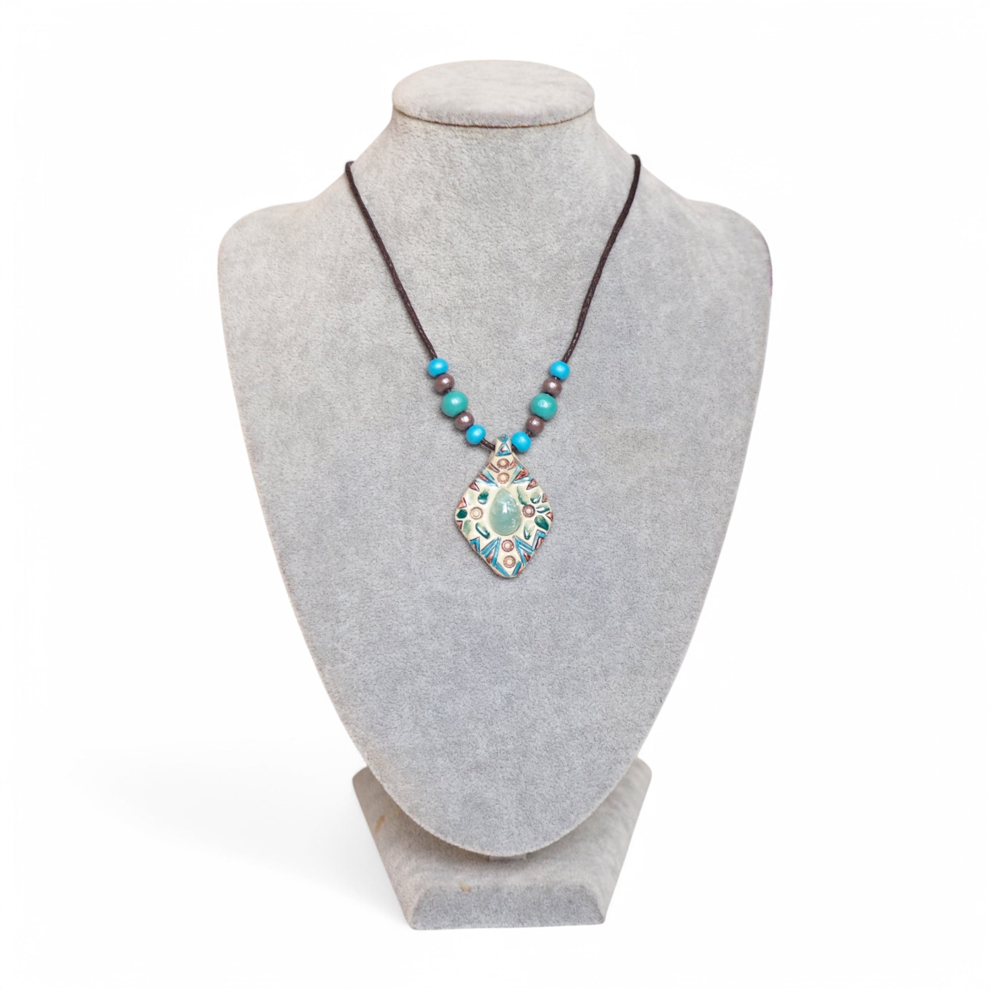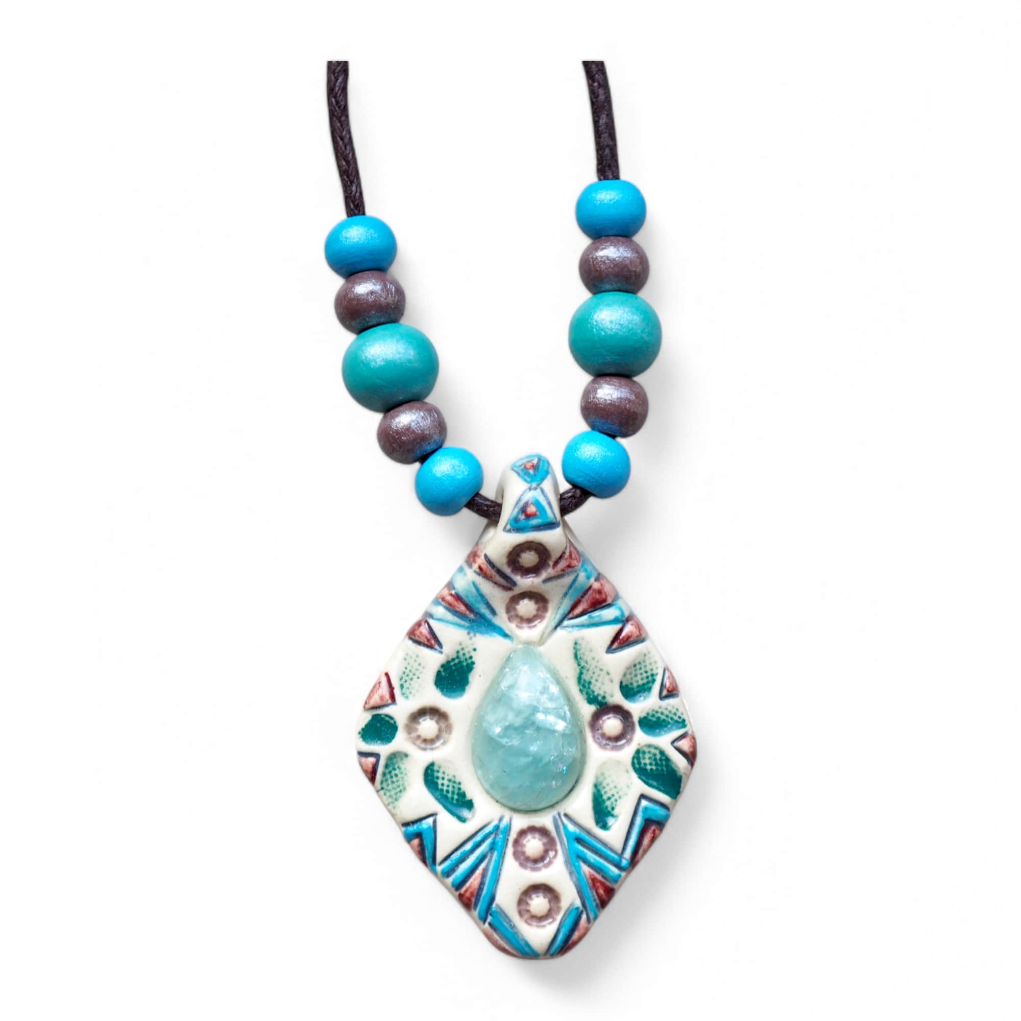 Materiał: ceramika, naturalne kamienie, bawełniany, woskowany sznurek, drewniane koraliki