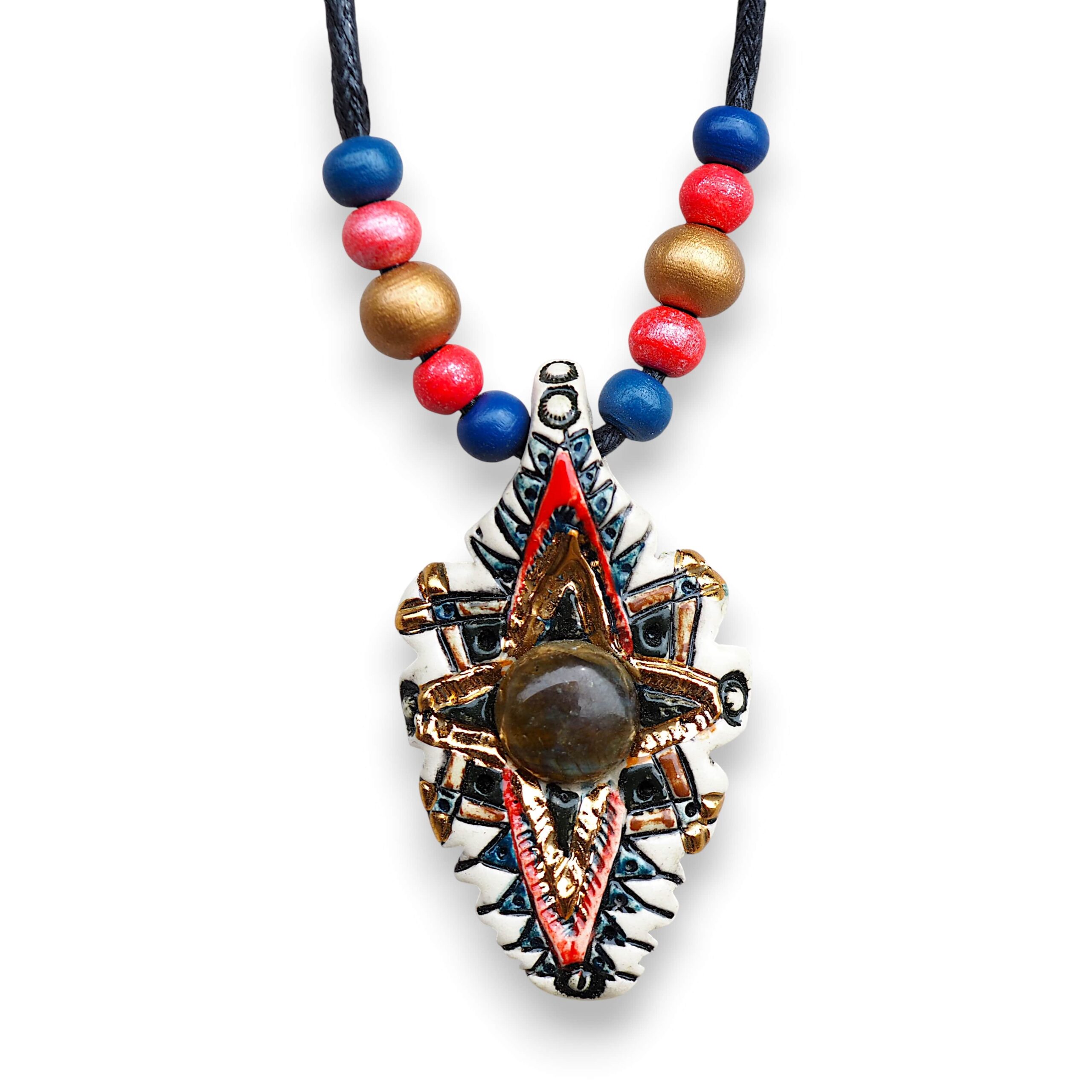 Materiał: ceramika, naturalne kamienie, bawełniany, woskowany sznurek, drewniane koraliki