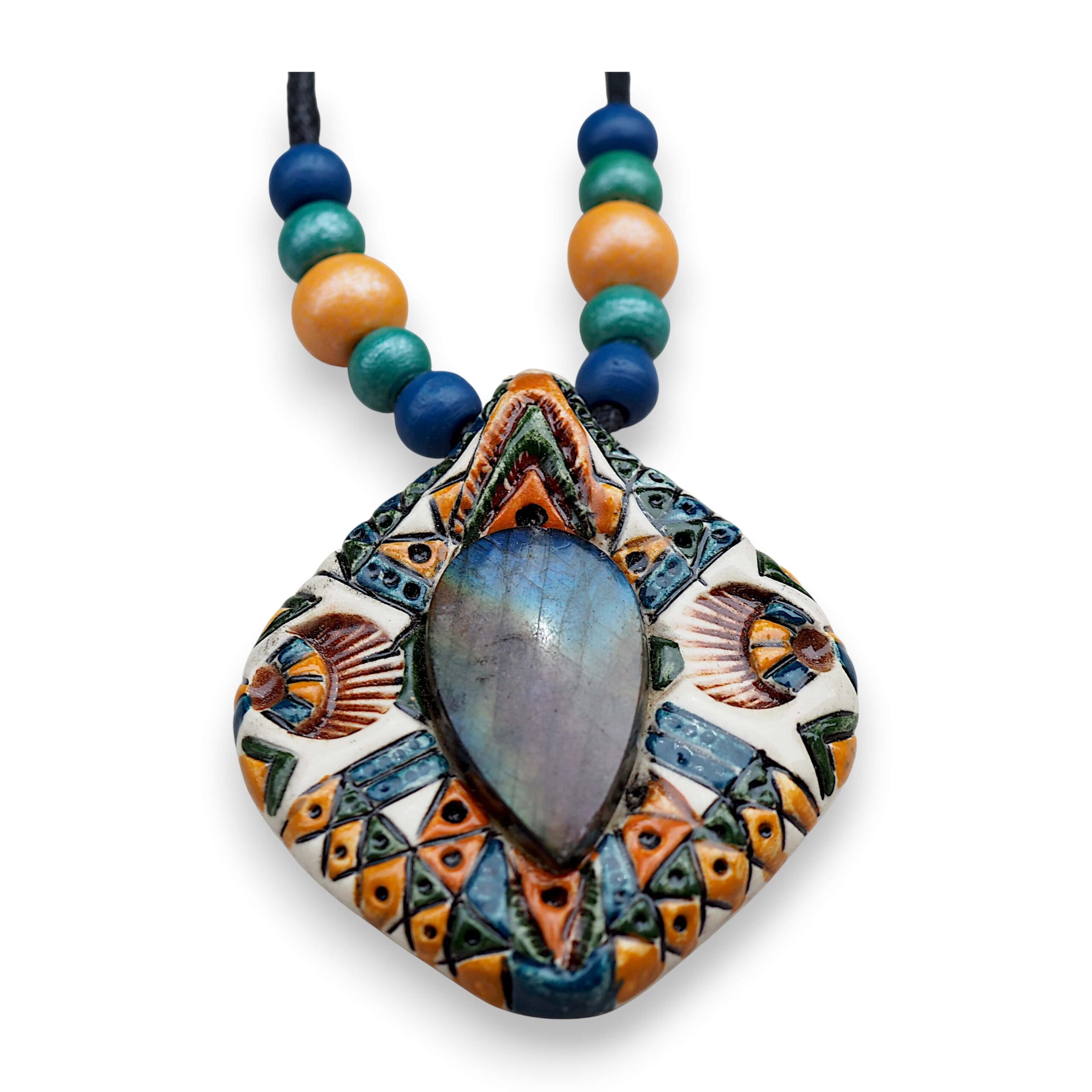Materiał: ceramika, naturalne kamienie, bawełniany, woskowany sznurek, drewniane koraliki