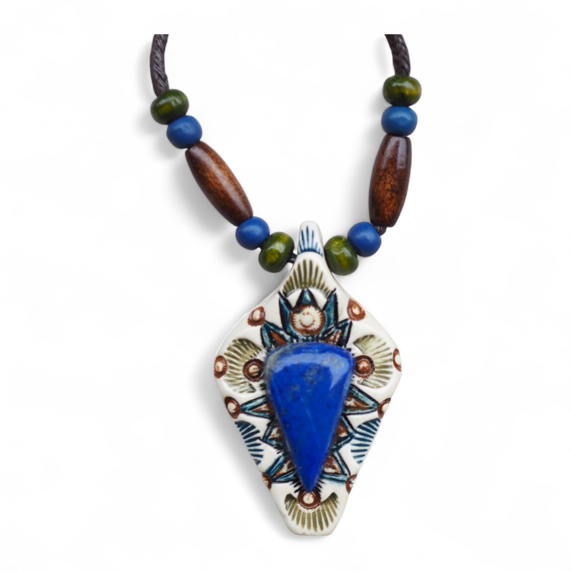 Materiał: ceramika, naturalne kamienie, bawełniany, woskowany sznurek, drewniane koraliki