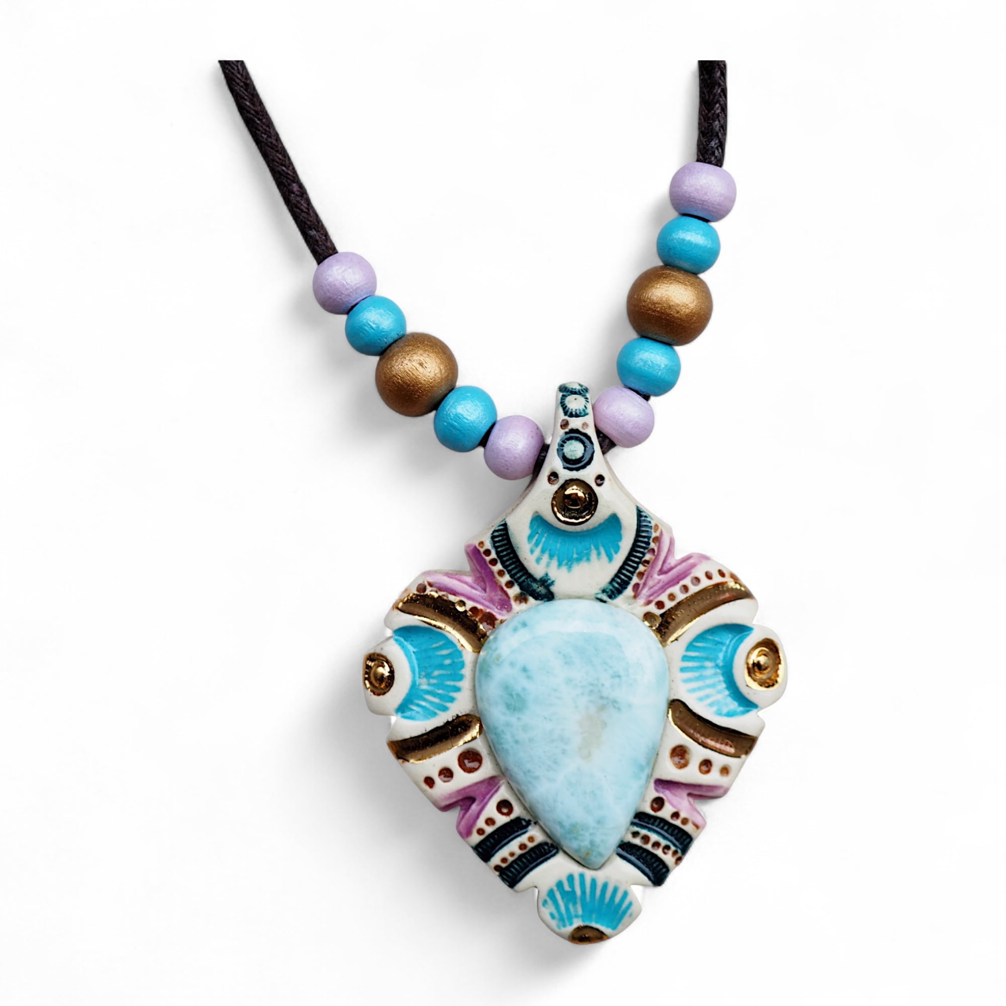 Materiał: ceramika, naturalne kamienie, bawełniany, woskowany sznurek, drewniane koraliki