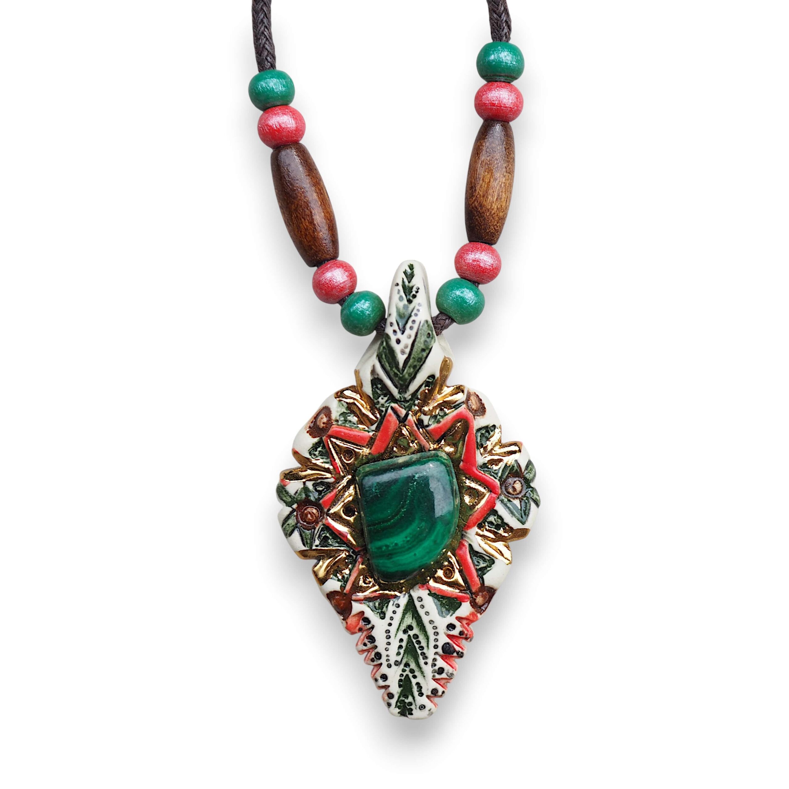 Materiał: ceramika, naturalne kamienie, bawełniany, woskowany sznurek, drewniane koraliki