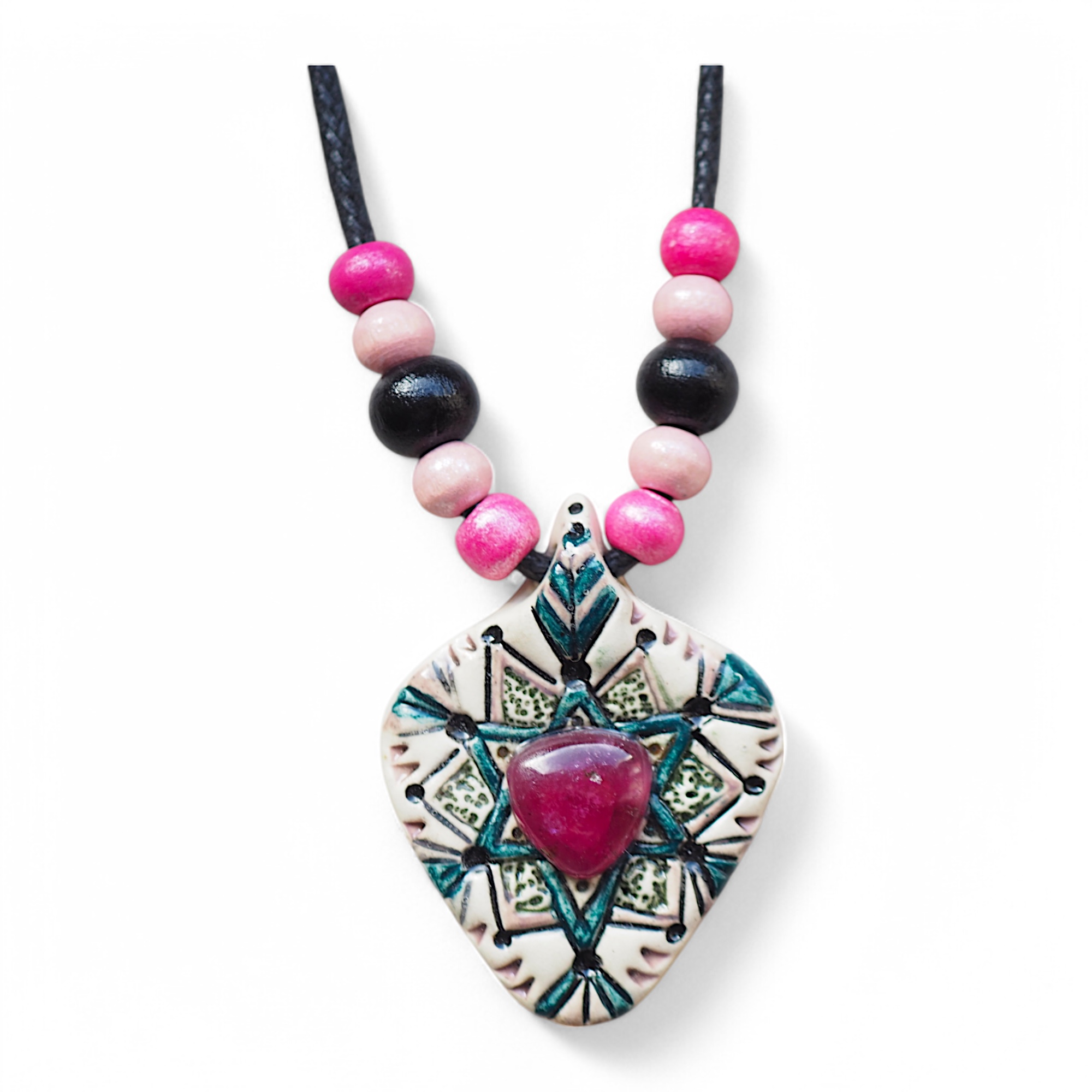 Materiał: ceramika, naturalne kamienie, bawełniany, woskowany sznurek, drewniane koraliki