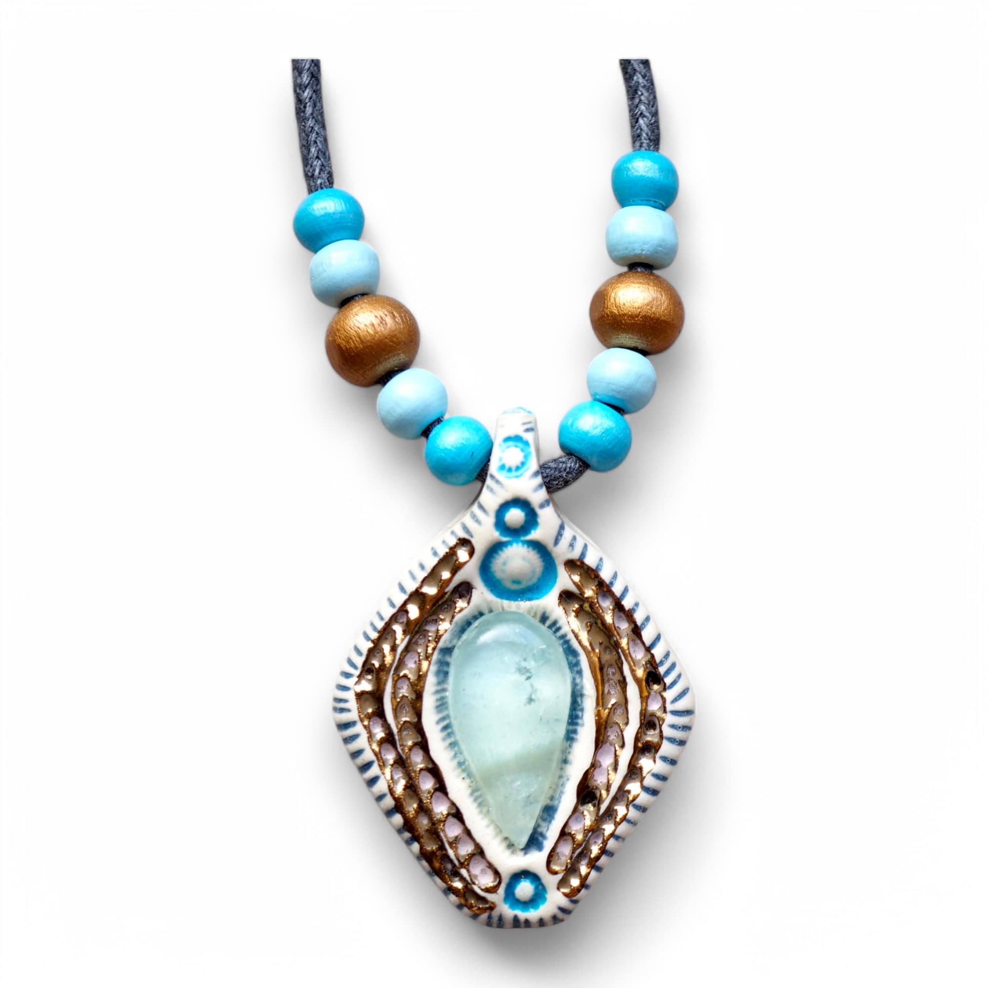 Materiał: ceramika, naturalne kamienie, bawełniany, woskowany sznurek, drewniane koraliki